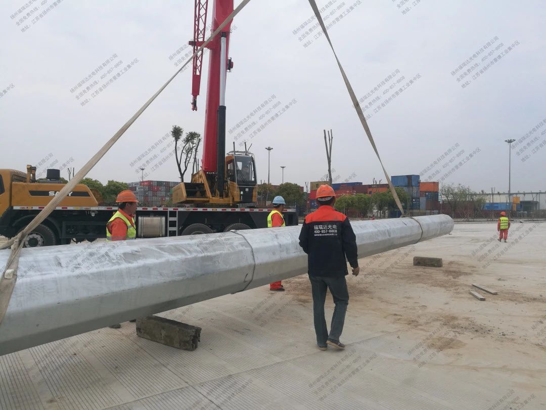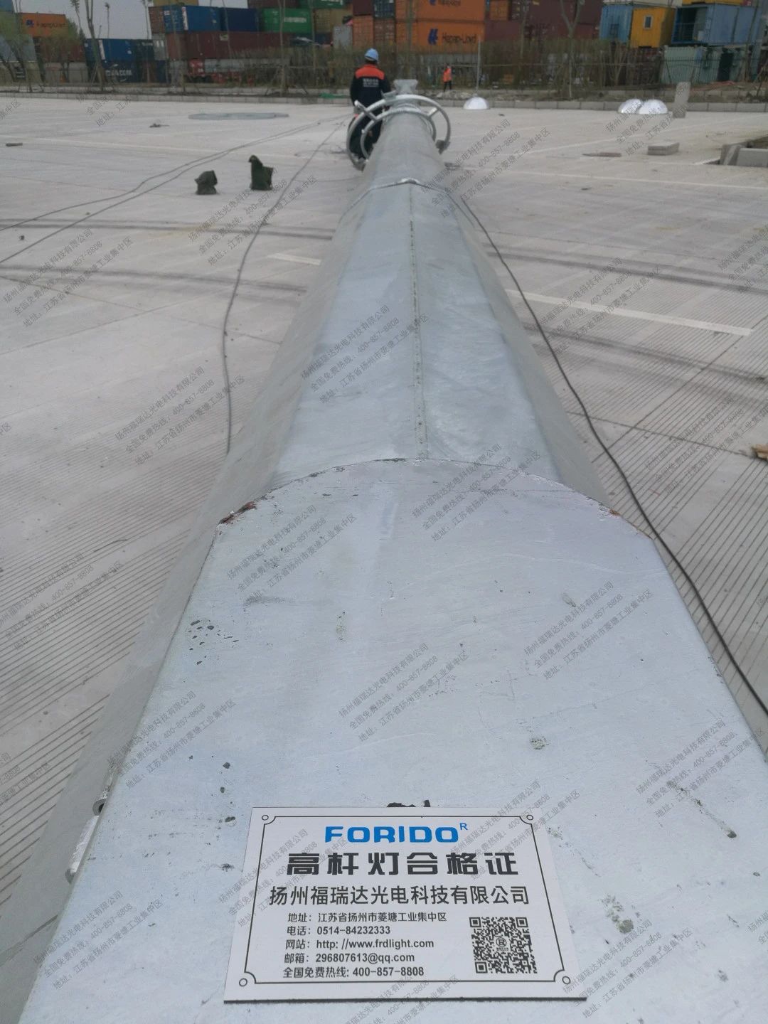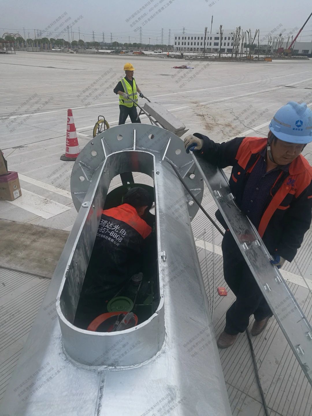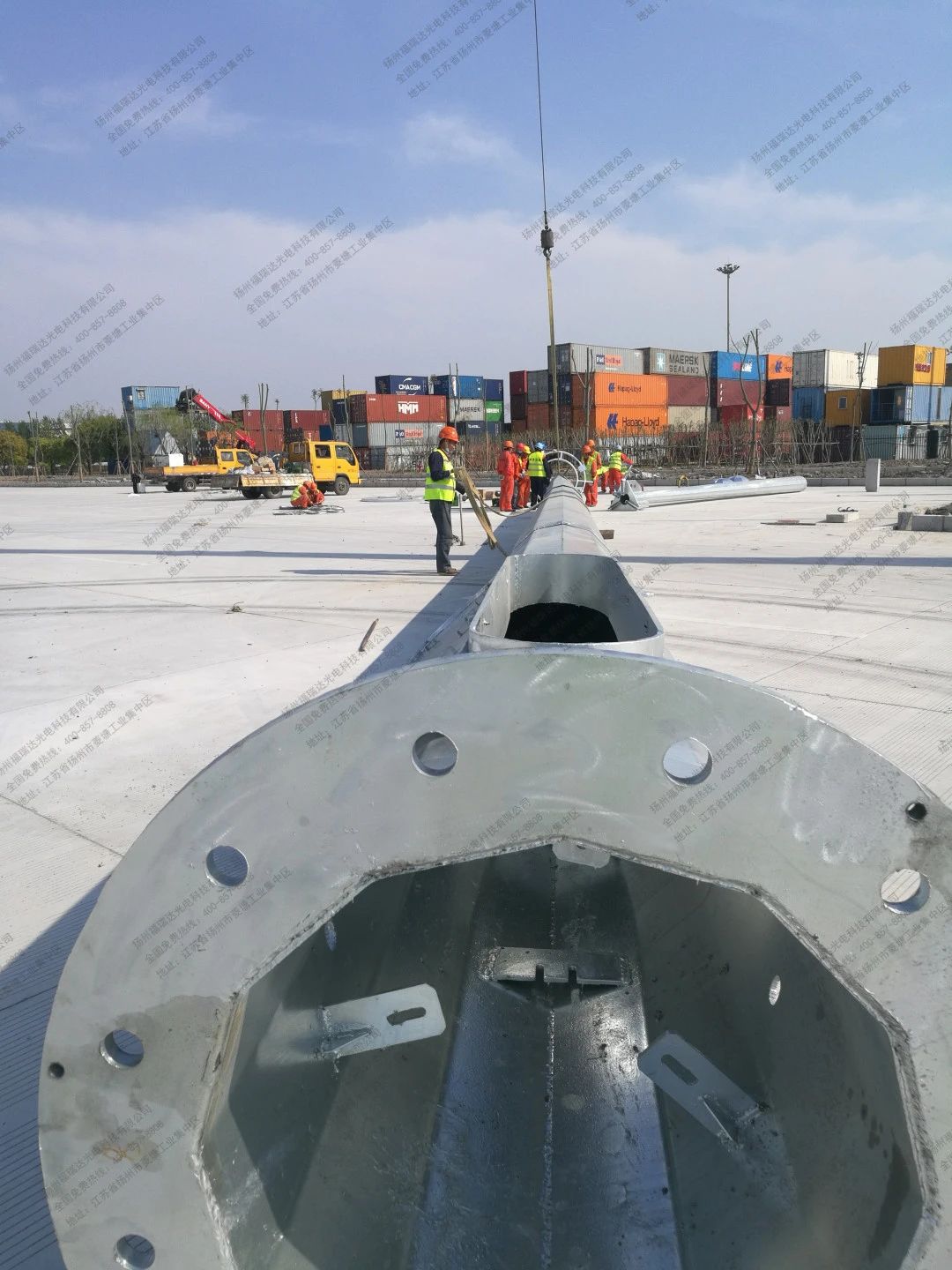 五一勞動節假日開始的第一天,我公司順利將65套35米高雙升降系統高桿燈,交貨到上海某港口。工人們也放棄假期休息,以激昂飽滿的工作狀態、分工有序地投入到施工安裝現場,確保工期按時保質完成。